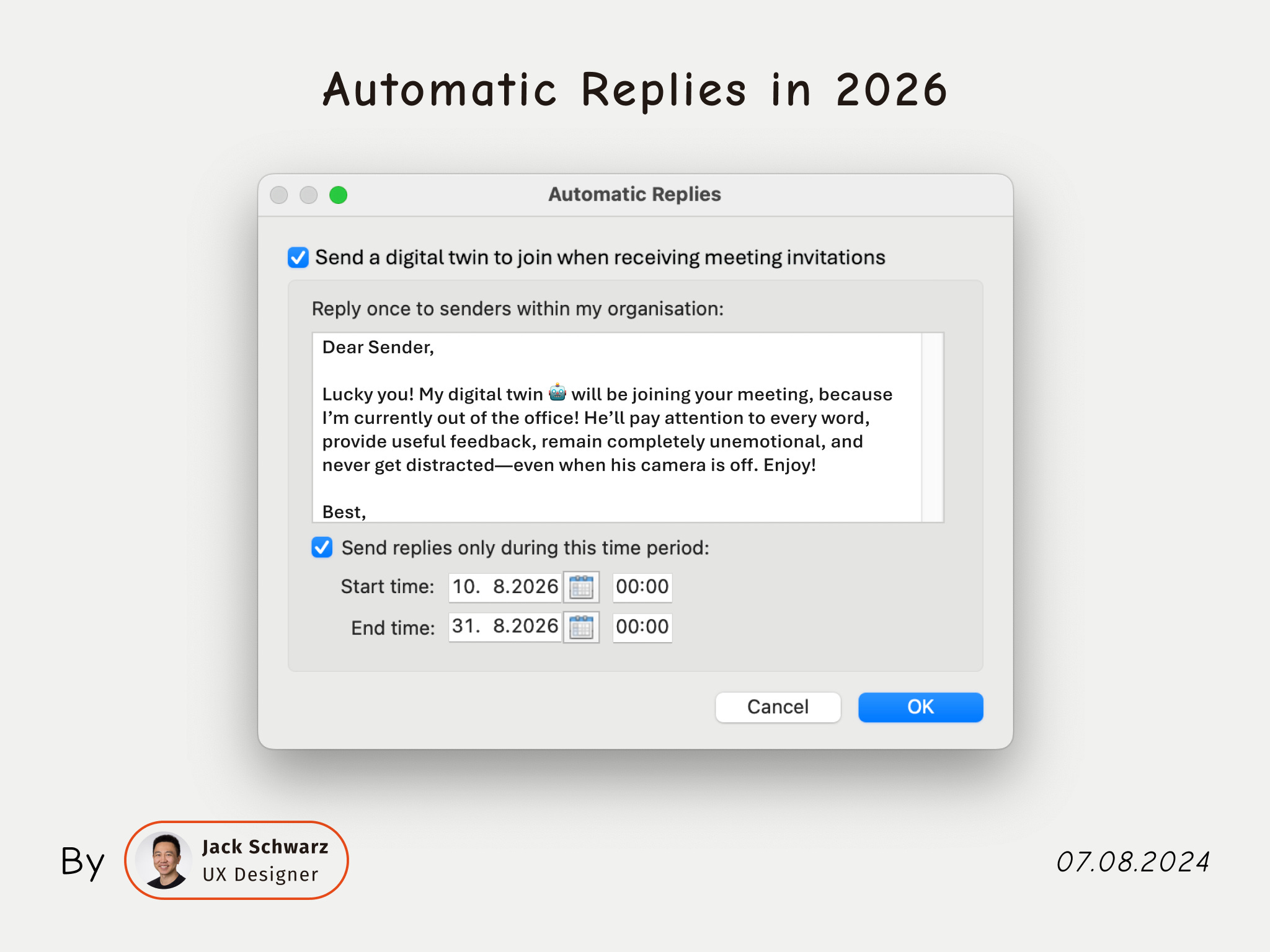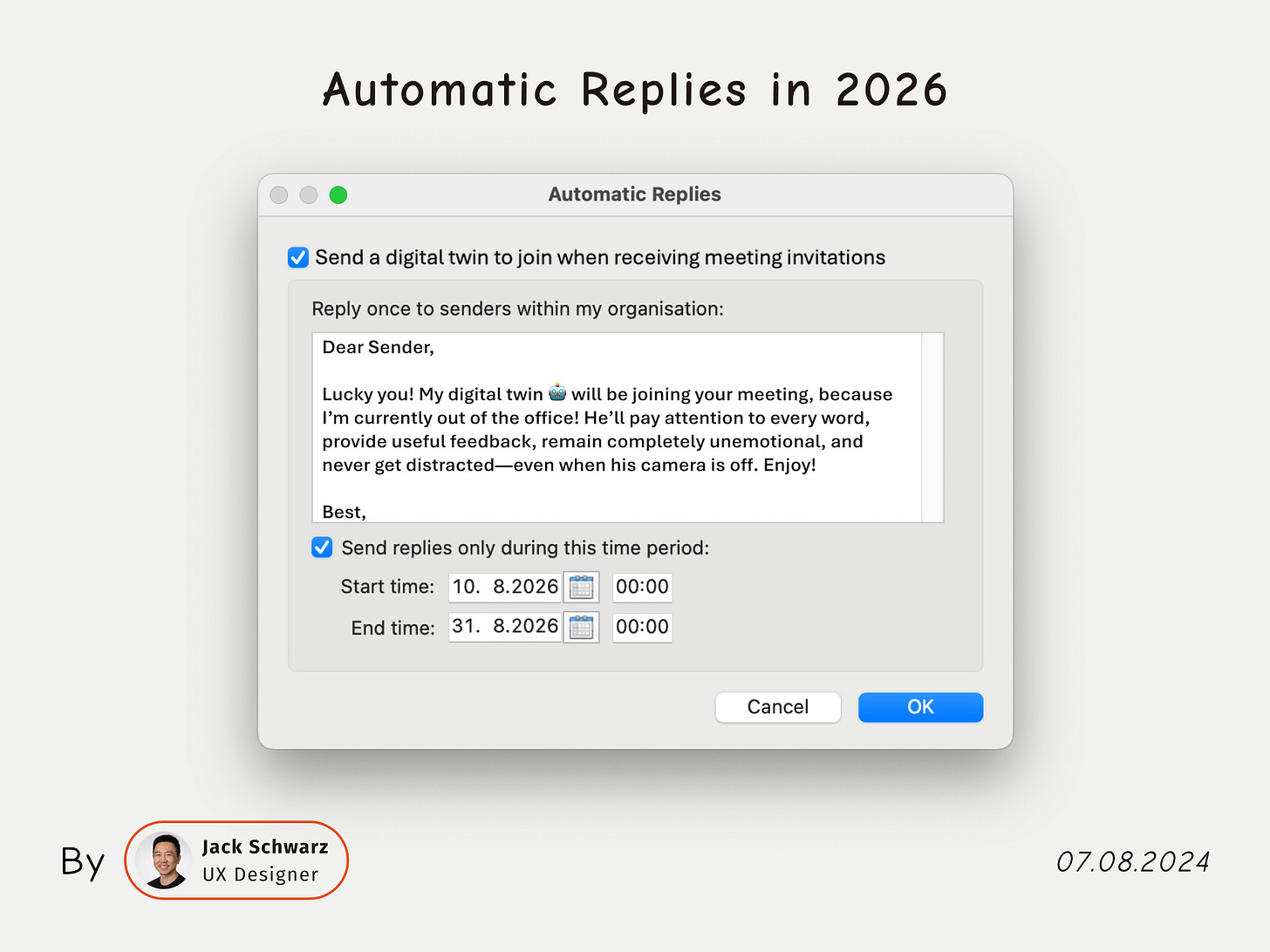 Automatic replies in 2026Jack SchwarzAug 11, 2024ShareIn 2026, we can send a digital twin to join the meetings when we enjoy our vacation. 🤖PreviousNext