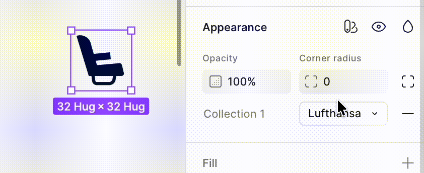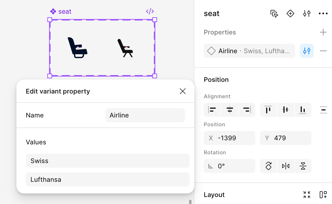 Each airline has its own icon set, but Figma Variables don’t support switching icon files directly. To work around this, we grouped icons into components and stored the different airline versions as variants inside the same component. Each variant has a property called “Airline,” which tells Figma which brand it belongs to.