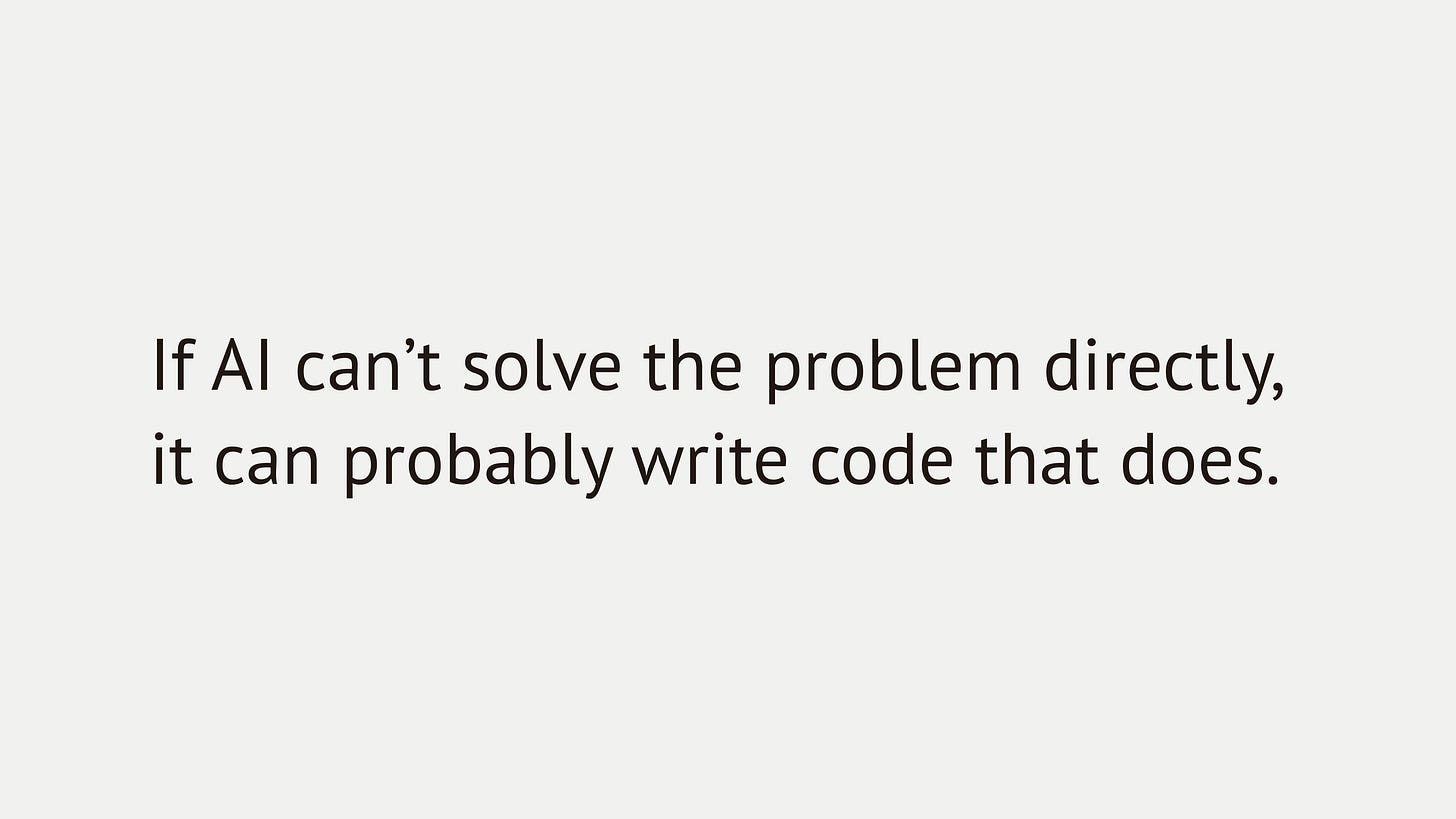 AI changes that calculation. Code has never been so cheap and disposable. For many repetitive and tedious tasks, you can use AI to quickly generate a script or plugin to automate them, if they can’t be directly handled by AI. It doesn’t matter if you only use the code once, because it costs little and the benefit is high if it works.