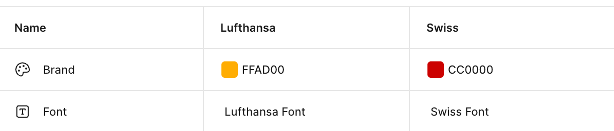 Using the same example, we can define different “Modes” such as “Lufthansa” and “Swiss.” Each mode contains the brand-specific values for things like text styles and colors: